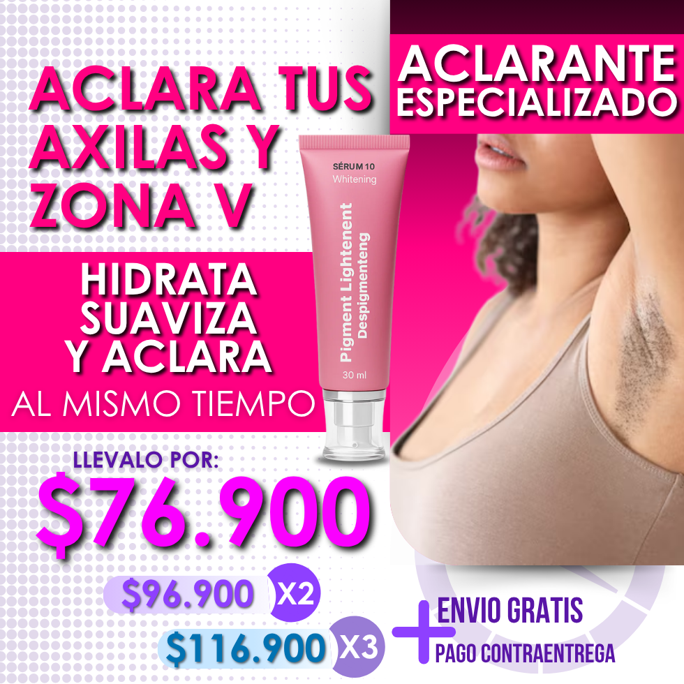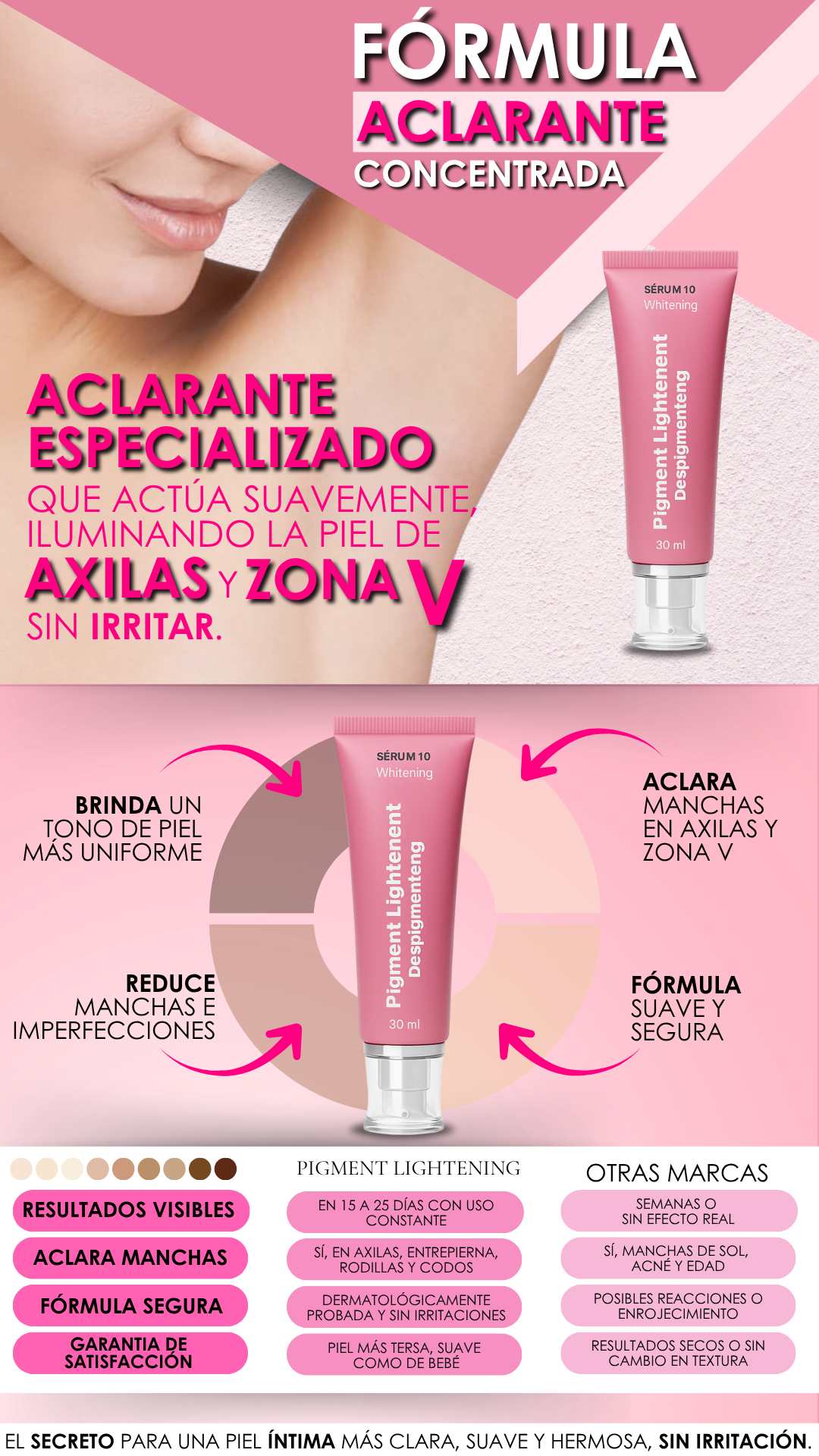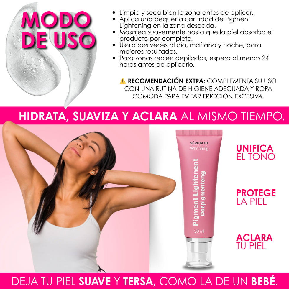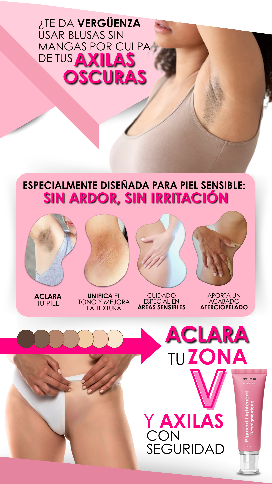 Después de usar Pigment S10, luce con confianza tus blusas favoritas, mostrando unas axilas claras, una piel más clara, luminosa y uniforme.